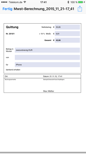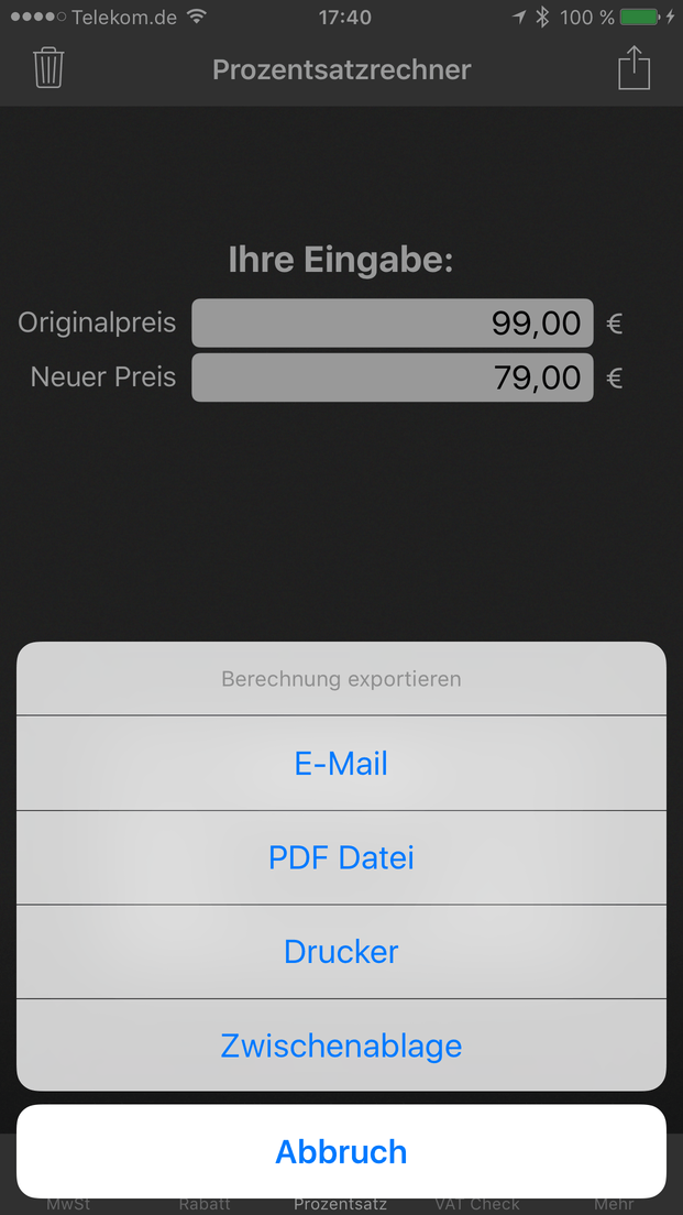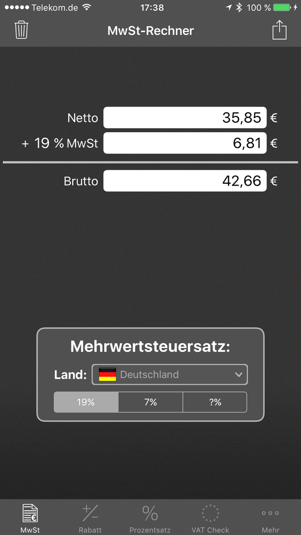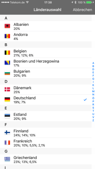 Auf dieser Seite sehen Sie Screenshots der wichtigsten Programmfunktionen des Mobilen MwSt-Rechner. Die Screenshots wurden mit der iPhone und iPad Version der Software erzeugt (unter iOS 7) und beziehen sich auf die Version 3.8.